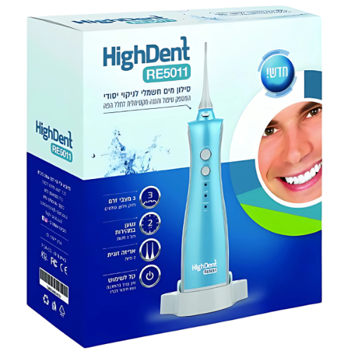 סילון מים חשמלי נטען של HighDent לניקוי יסודי של השיניים והחניכיים בלי חיבור לברז.